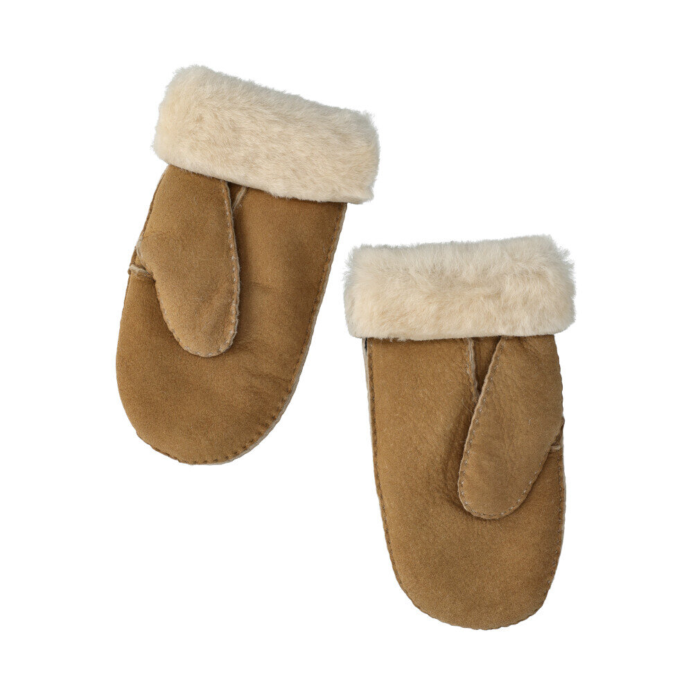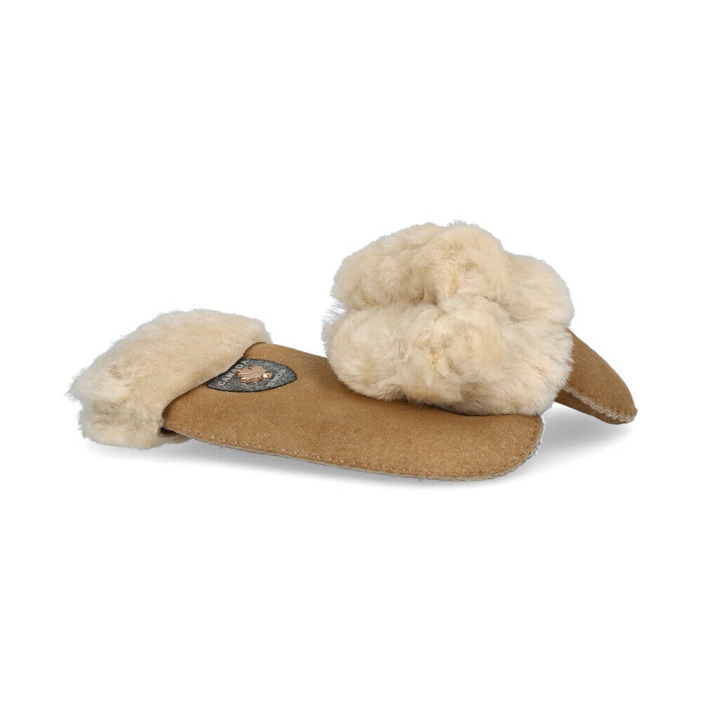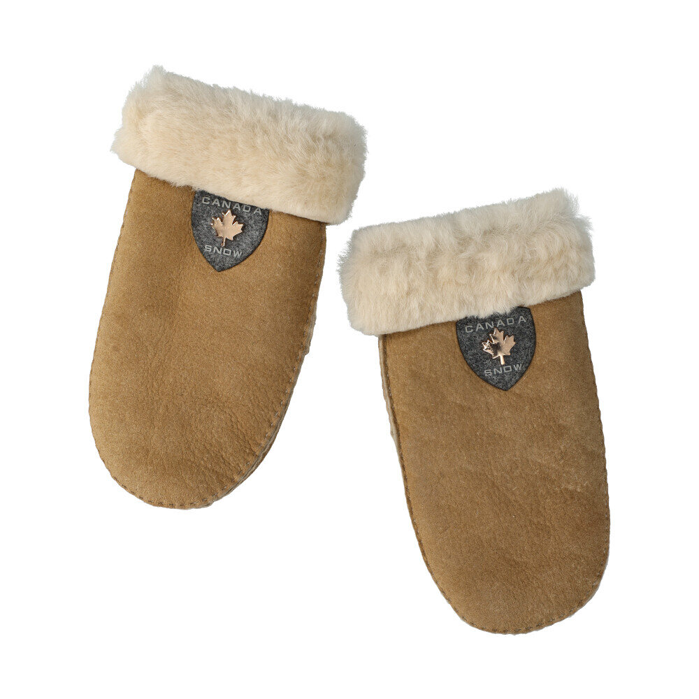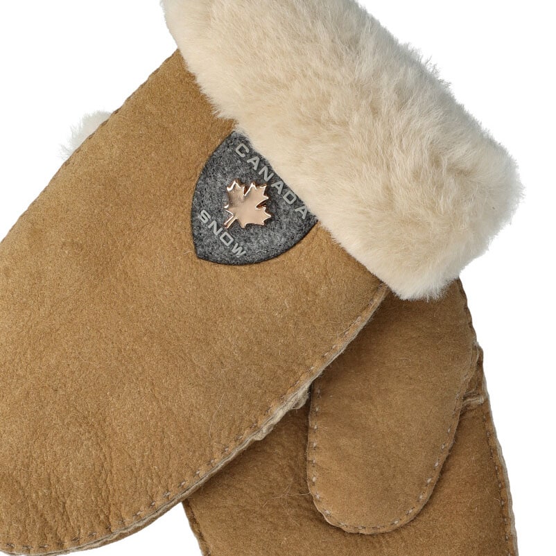 Edet, warm mittens from Canada Snow. Beige sheepskin gloves with sheepskin lining. The outside has a water-repellent effect and a stylish logo in gold-colored metal and grey felt on the top. Women's size S, M, L.