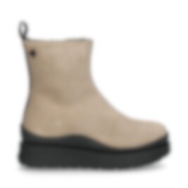 Mount Meer, a boot from Canada Snow. Upper in beige water- and dirt-repellent suede with details in black leather and black lacquered leather at the backside. YKK zipper for easier entry. Lined with sheepskin lining, and a layer of textile for extra thermal insulation. The insole has 4 heat insulating layers; cork, aluminium, thinsulate and sheepskin. Chunky outer sole, made of several different materials, e.g. EVA, TR-light and rubber to keeping it lightweight. Outsole with rougher pattern for better grip.